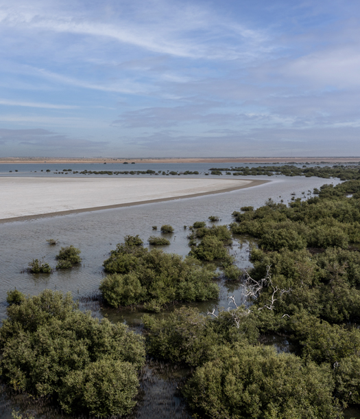 تخزّن أشجارُ المانغروف (4) أضعاف كمية الكربون مقارنةً بالغابات الأرضية، بفضل تربتها العميقة الغنيّةِ بالمواد العضوية. وعلى امتداد سواحل البحر الأحمر والخليج العربي، تُشكّل هذه الغاباتُ دعامةً حيويةً لاستقرار النظُم البيئية الساحلية، وتوفِّر موائلَ غنيةً للحياة البحرية، وتُعدُّ من أكفأ مصائد الكربون الأزرق عالمياً؛ بفضل الرواسب العضوية، وعمليات إذابة الكربونات الفريدة المُعزِّزة لامتصاص ثاني أكسيد الكربون بما يتجاوز الآليات التقليدية للدفن، لتكون حليفاً استراتيجياً في المعركة العالمية ضد تغير المُناخ.(1)(2)(3)(4)