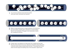 في الموصل العادي، تتدافع الإلكترونات مع بعضها البعض ومع المادة. عندما تصبح المادة موصلًا فائقًا، تتحد الإلكترونات في أزواج، أزواج كوبر، التي تتصرف كما لو كانت جسيما واحدا يملأ الدائرة الكهربائية بأكملها. (المصدر: موقع جائزة نوبل)