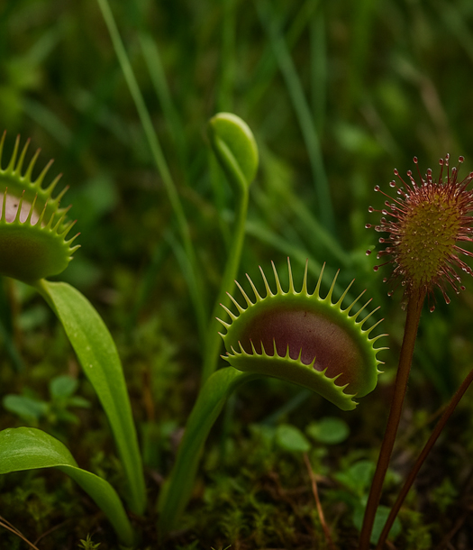 ليست جميع النباتات وديعةً كما نراها في الحدائق. فهناك أنواع مفترسة تجذب الحشرات بخداعٍ محسوب ثم تلتهمها لتقتات منها. من أشهرها نبات فينوس آكلة الذباب (Dionaea muscipula)، الذي تغري أوراقه المزدوجة الحشرة برائحةٍ زكية، وما إن تلامسها حتى تنطبق عليها في لحظة، لتتحول إلى وجبة غنية بالنيتروجين. أما نبات الدروسيرا (Drosera) فيفرز مادة لاصقة على أوراقه تلمع كالندى فتغري الفريسة بالهبوط، لكنها سرعان ما تُحتجز وتُهضم. هذه الحيل الحيوية ليست أفعالًا عشوائية، بل استراتيجيات محسوبة تحاكي التفكير، تنفذها خلايا النبات بذكاء كيميائي مدهش.