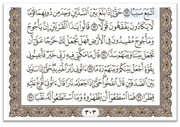 آتُونِي زُبَرَ الْحَدِيدِ ۖ حَتَّىٰ إِذَا سَاوَىٰ بَيْنَ الصَّدَفَيْنِ قَالَ انْفُخُوا ۖ حَتَّىٰ إِذَا جَعَلَهُ نَارًا قَالَ آتُونِي أُفْرِغْ عَلَيْهِ قِطْرًا ﴿96﴾