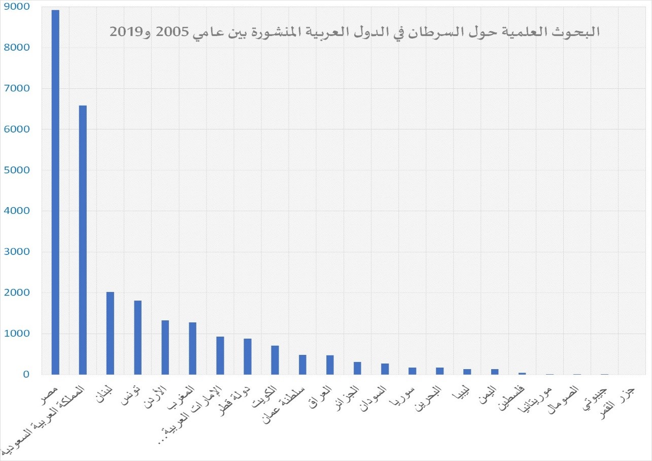 وتظهر احصائيات الإصابة بالسرطان في الوطن العربي أن نسب الإصابات تتراوح بين 0.43 بالمائة في اليمن و1 بالمائة في قطر وليبيا عام 2017، وهي نسب إصابة متوسطة مقارنة بالدول الأوروبية وشمال أمريكا. لكن ماذا عن جهود البحث العلمي العربية في مجابهة هذه الآفة التي تحصد سنويا عشرات الآلاف من الأرواح في المنطقة؟ للإجابة على هذا السؤال، قام فريق من الباحثين من الجامعة اللبنانية بتقييم نشاط أبحاث السرطان في العالم العربي وتطوره بين عامي 2005 و2019. ونشرت الدراسة على موقع (researchsquare) في شهر أبريل الماضي قبل مراجعتها من الأقران.