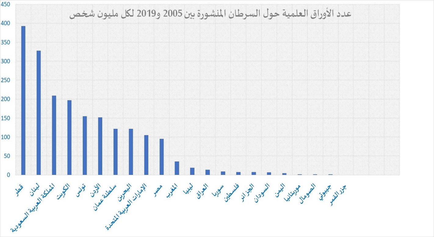 من حيث عدد المنشورات لكل مليون نسمة، احتلت قطر المرتبة الأولى بنسبة 394.74 ورقة لكل مليون شخص، تليها لبنان والسعودية. أما بالنسبة لحصة كل بلد من الأوراق البحثية المتعلقة بالسرطان من إجمالي أبحاثه المنشورة، فقد احتل المغرب المرتبة الأولى، حيث كانت نسبة 16.75% من إجمالي منشوراته متعلقة بالسرطان، متقدما على مصر (16.73%) ولبنان (16.51%).