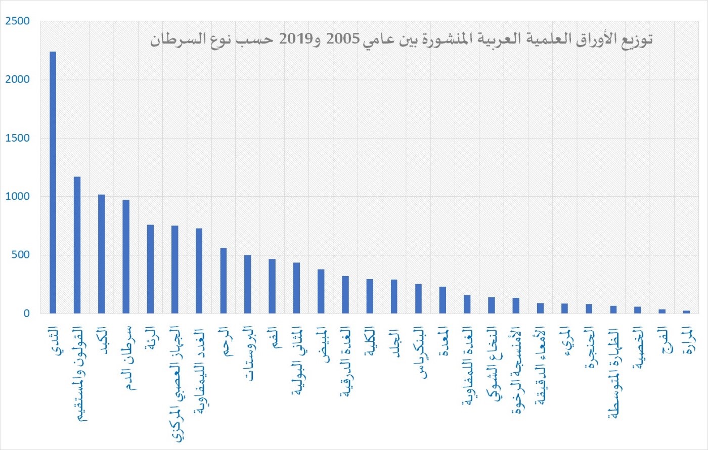 تناولت الأوراق العلمية العربية المنشورة المتعلقة بالسرطان خلال فترة الدراسة 27 نوعًا من السرطانات، وحاز سرطان الثدي على النصيب الأكبر من هذه الأوراق (2241). وكان لكل من سرطانات القولون والمستقيم وسرطان الكبد أكثر من 1000 ورقة، في حين أن سرطانات الخصية والفرج والمرارة كان لها أقل عدد من المنشورات.