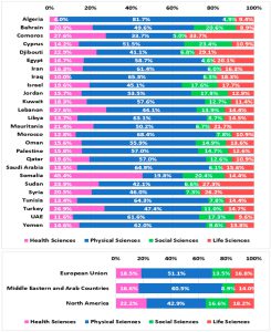 استكشف المؤلفون كذلك مجالات البحث الأكثر انتشارًا في إجمالي المخرجات العلمية التي أنتجتها دول المنطقة خلال فترة الدراسة، وتظهر النتائج هيمنة كل من تركيا وإيران تليهما العرية السعودية ومصر على عدد من المجالات البحثية من حيث عدد المنشورات مثل مجال العلوم الزراعية والبيولوجية والكيمياء والعلوم البيئية والهندسة والطب. في المقابل برزت عدد من الدول العربية التي تمتلك مخرجات بحثية أقل بجودة البحوث في بعض المجالات، فاحتلت قطر، على سبيل المثال، الصدارة بين دول المنطقة في قيمة مؤشر “تأثير الاستشهادات الميداني المرجح” FWCI لبحوثها المنشورة في أبحاث علوم الكمبيوتر التي بلغت 2.13 (مما يعني أن هذه المنشورات كان لها معدل استشهادات يفوق ضعفي متوسط الاستشهادات لجميع البحوث المنشورة في المجال خلال السنوات الثلاث السابقة لسنة نشر هذه البحوث) وبالمثل برزت كذلك كل من ليبيا (4.27)، وفلسطين (3.09)، واليمن (3.98) في أبحاث الطب.