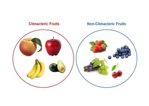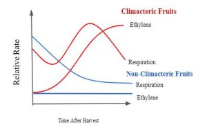 تنقسم الثمار عمومًا إلى مجموعتين: ثمار كلايمكتيرية (لها ذروة تنفس أثناء النضج)، والنوع الثاني هو ثمار غير كلايمكتيرية (ليس لها ذروة تنفس). وبشكل عام، يمكن للثمار الكلايمكتيرية أن تنضج بعد الحصاد، في حين لا يمكن للثمار غير الكلايمكتيرية النضج بعد الحصاد. وتتميز الثمار الكلايمكتيرية النضج بزيادة معدل التنفس، ثم زيادة كبيرة في تخليق الإيثيلين أثناء النضج (الشكل 1). كما يُعرف إنتاج الإيثيلين في هذه الثمار أيضًا بالتحفيز الذاتي، مما يعني أن التركيز الأولي للإيثيلين يسبب زيادة في إنتاج الإيثيلين. وهذا يعني أنه بمجرد بدء إنتاج الإيثيلين، تزيد الثمار بشكل طبيعي من كمية الإشارة التي يتم إنتاجها لتسريع النضج. ومن أمثلة الثمار الكلايمكتيرية ثمار الطماطم والتفاح والجوافة والمشمش والخوخ وغيرها. تتميز الثمار غير الكلايماكتيرية بنمط نضج مختلف، فهي لا تشهد ذروة إنتاج الإيثيلين أو التنفس أثناء النضج (الشكل 1)؛ وبالتالي، يجب حصادها عندما تنضج تمامًا. ومنها ثمار الباذنجان والخيار والعنب والحمضيات وغيرها.