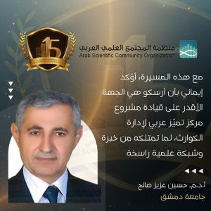 بمناسبة مرور خمسة عشر عامًا على انطلاق منظمة المجتمع العلمي العربي (أرسكو)، منارة العلم والعلماء، أتقدّم بأصدق التهاني القلبية للقائمين على هذه المنظمة العريقة، التي تعني بالنسبة لي الإطار المتكامل للبحث العلمي التطبيقي التنموي، المبني على منصة علمية قوية داعمة للباحثين والعلماء العرب في مختلف المجالات العلمية والبحثية. ويعود هذا التقدير إلى تجربتي الشخصية مع أرسكو والقائمين عليها.